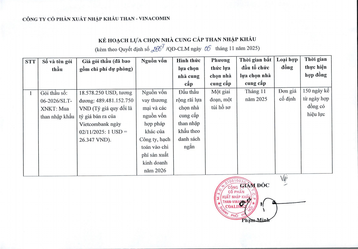 06/11/2025 Thông báo Kế hoạch lựa chọn nhà cung cấp, Gói thầu số 06-2026/SLT-XNKT: Mua than nhập khẩu Mã đấu thầu: KH 06-2026/SLT-XNKT Thời gian: -