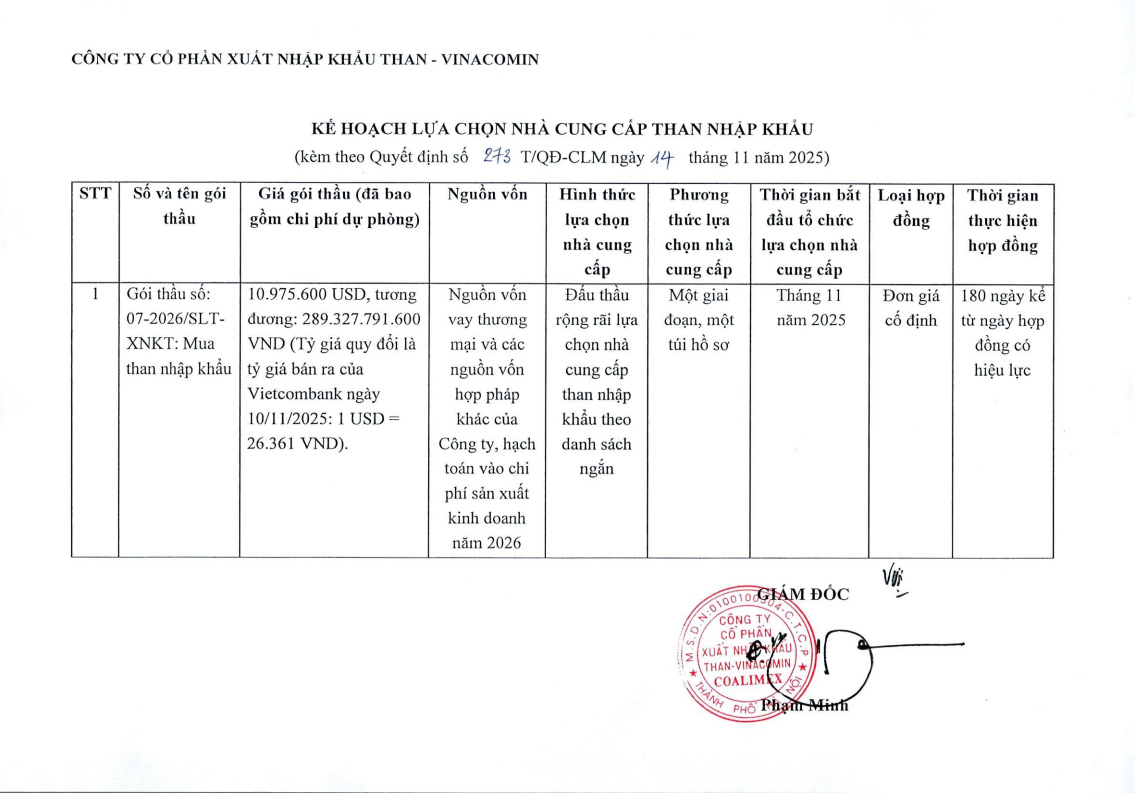 17/11/2025 Thông báo Kế hoạch lựa chọn nhà cung cấp, Gói thầu số 07-2026/SLT-XNKT: Mua than nhập khẩu Mã đấu thầu: KH 07-2026/SLT-XNKT Thời gian: -