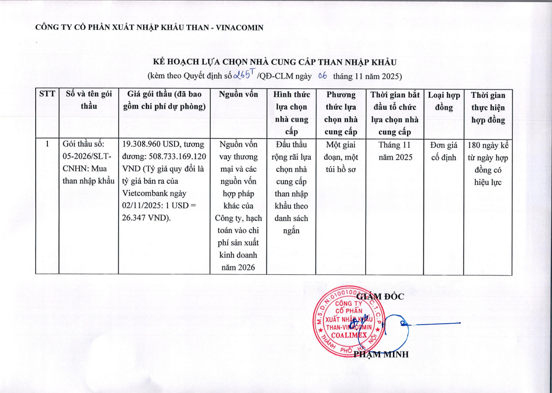 06/11/2025 Thông báo kế hoạch lựa chọn nhà cung cấp than khẩu Gói thầu số: 05-2026/SLT-CNHN: Mua than nhập khẩu Mã đấu thầu: KH 05-2026/SLT-CNHN Thời gian: -