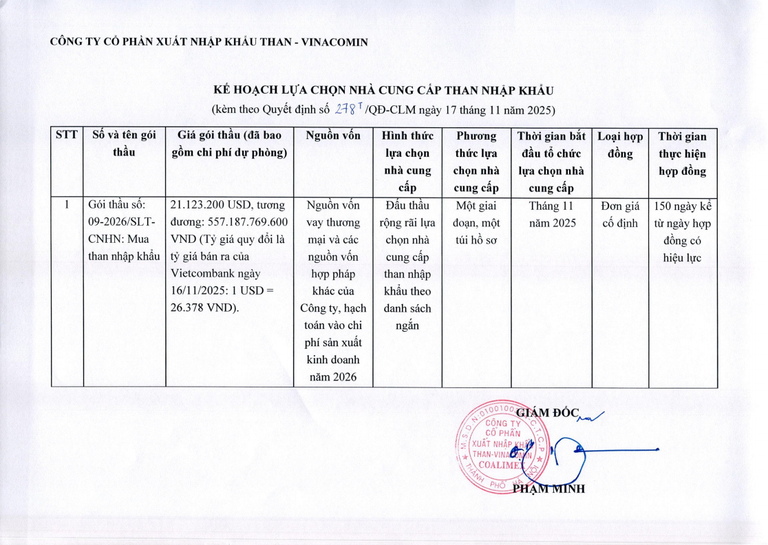 17/11/2025 Thông báo kế hoạch lựa chọn nhà cung cấp than khẩu Gói thầu số: 09-2026/SLT-CNHN: Mua than nhập khẩu Mã đấu thầu: KH 09-2026/SLT-CNHN Thời gian: -